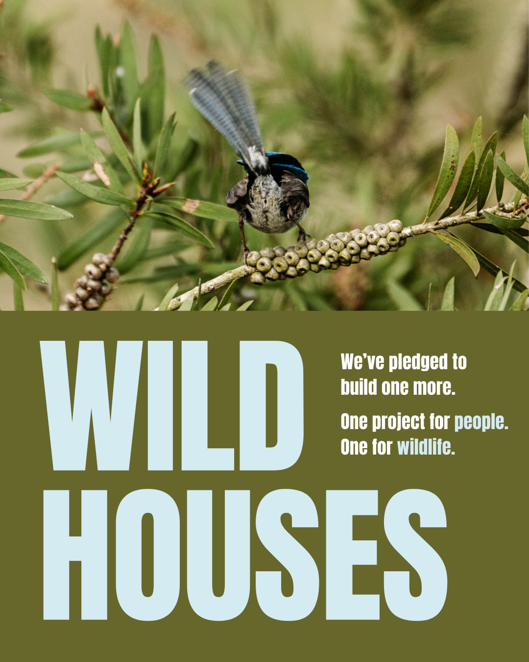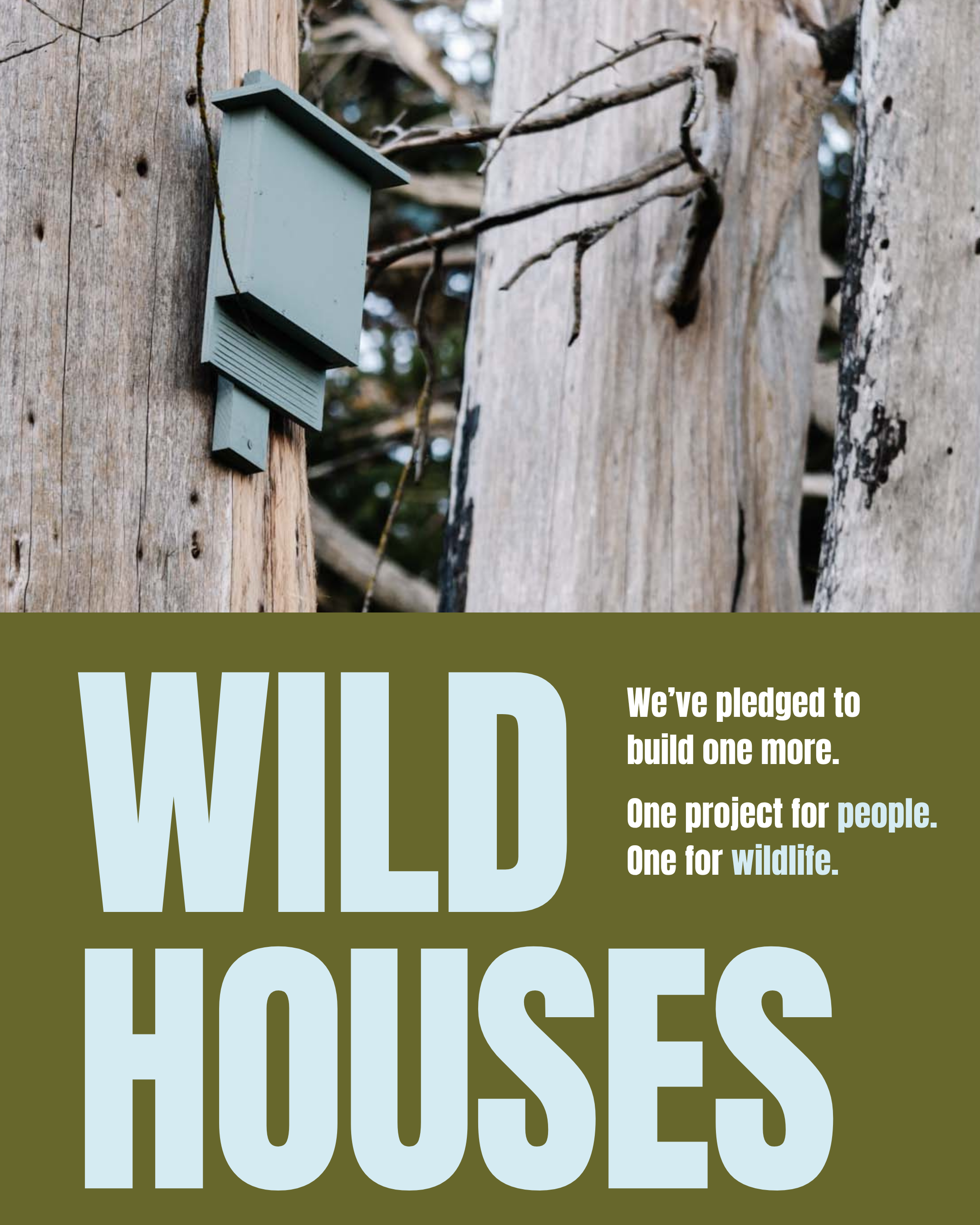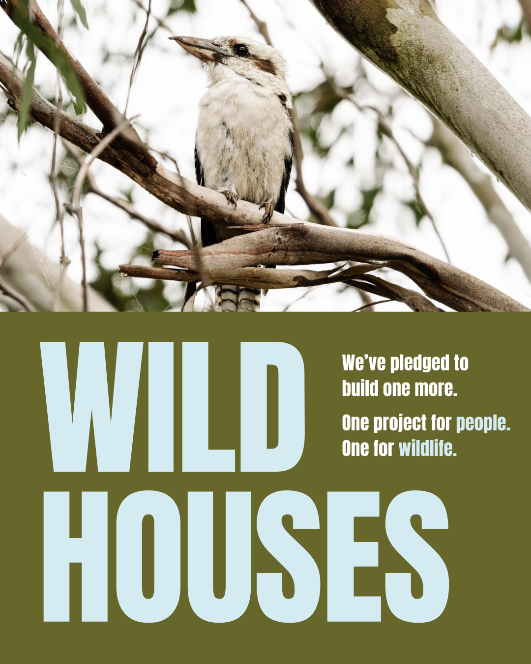 We build houses. This year, we're also funding wildlife houses. We've joined Wild Houses — a one-to-one pledge program for the built environment. For every home we deliver, one professionally installed nest box is funded at a conservation site in Australia. Tree hollows take over a century to form. We can clear a site in an afternoon. This is us doing something about that.